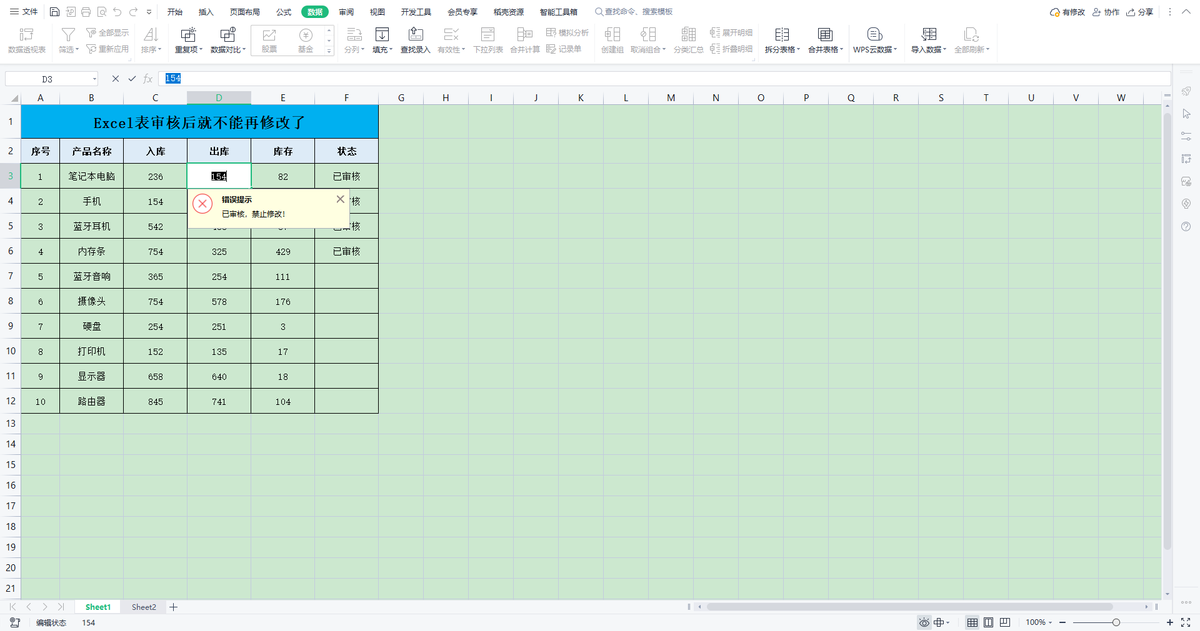 7、我们在状态列任意设置一行数据为“已审核”,可以看到再去修改数据,就会显示“已审核,禁止修改”的提示了;