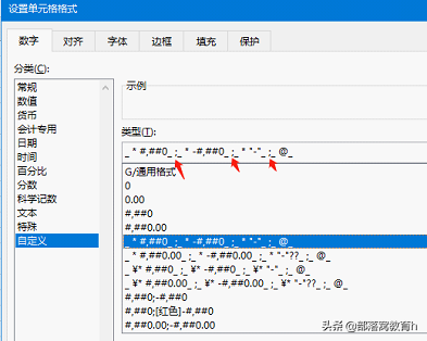 在自定义格式的规则中,将数据分成了四类,分别是正数,负数,零和文本,可以分别对这四类数据设置不同的格式,格式代码使用分号(英文状态的)进行分隔,具体分隔方式就是:正数格式;负数格式;零格式;文本格式