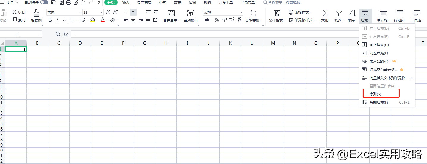②然后选中数字1的单元格,用鼠标点击开始-填充-序列