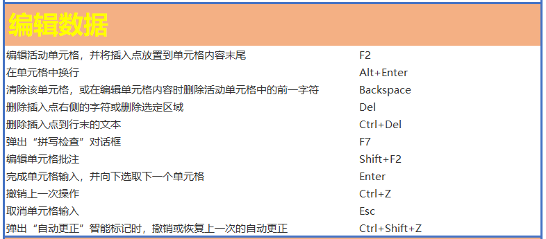 移动到工作表的最后一个单元格,位于数据中的最右列的最下行 Ctrl+End