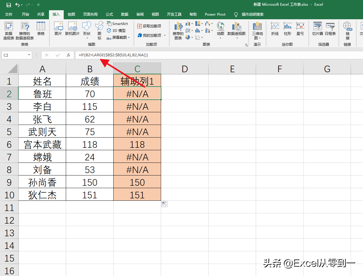 我们构建一个辅助列,然后在辅助列中输入公式:=IF(B2>LARGE($B$2:$B$10,4),B2,NA())我们使用if函数来返回前三名的成绩,在这里我们将if函数的条件设置为B2>LARGE($B$2:$B$10,4),而LARGE($B$2:$B$10,4)这个函数的值为成绩区域从大到小排列的第四个值也就是118分,如果成绩大于118就返回成绩,如果成绩不大于118就返回#NA这个错误值,在图表中#NA起到占位符的作用