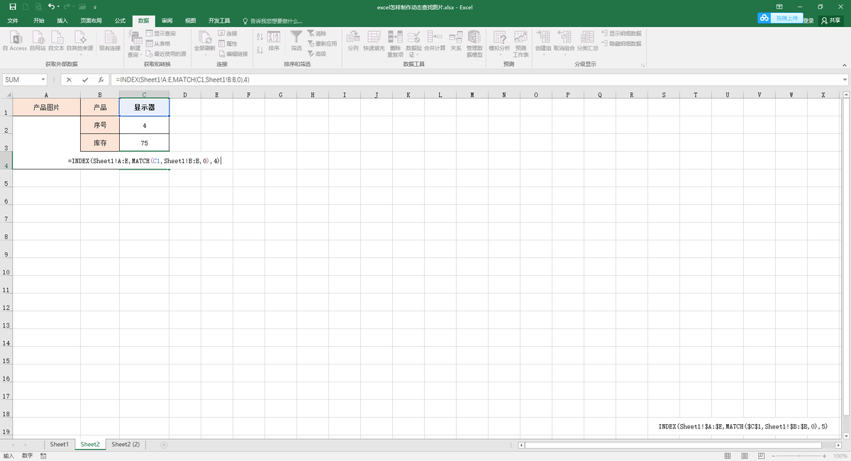 6、在C4单元格输入=INDEX(Sheet1!A:E,MATCH(C1,Sheet1!B:B,0),4),按Enter回车键,出库就设置好了,我们再来看看,当我们选择产品名称时,序号、库存、出库都在根据产品名称的不同,同时的发生了变化;