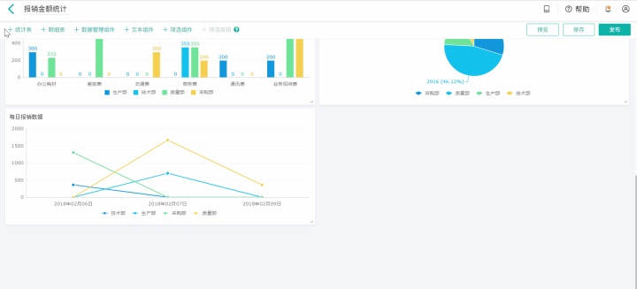一般情况下的报表,基本涵盖这些图表:汇总表、透视表、柱形图、条形图、面积图、饼图、折线图、雷达图、指标图和数据块。