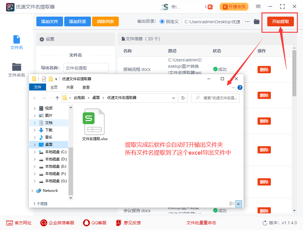 步骤3,设置完成后就可以点击右上角的【开始提取】按钮,启动软件程序了,完成提取后软件会自动打开输出文件夹,包含所有文件名的excel文件就会导出到这里。