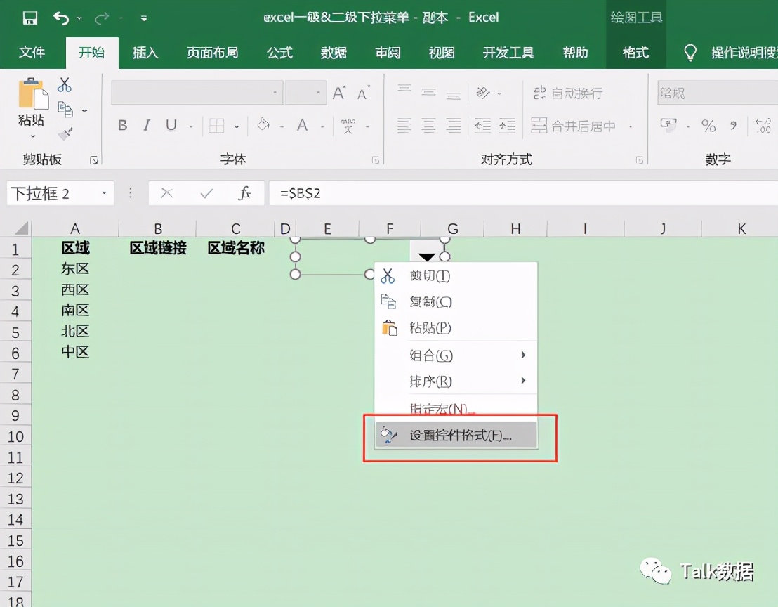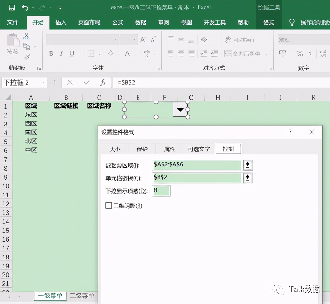 单元格链接:你进行菜单选择后需要结果显示在哪里,这里选择$B$2(区域链接部分);