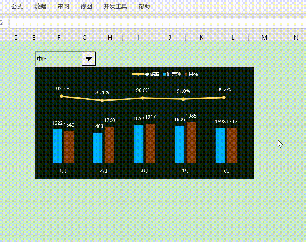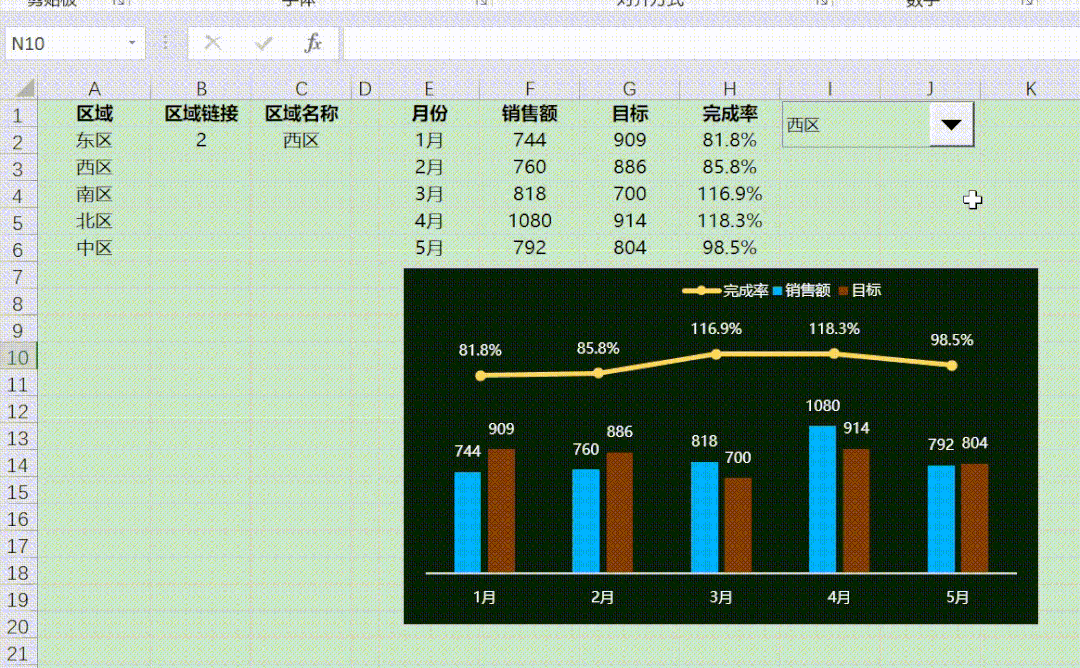 然后根据区域名称制作动态图表。这样一级下拉菜单制作的动态图表就好了。