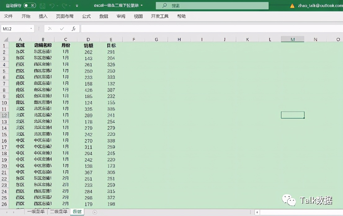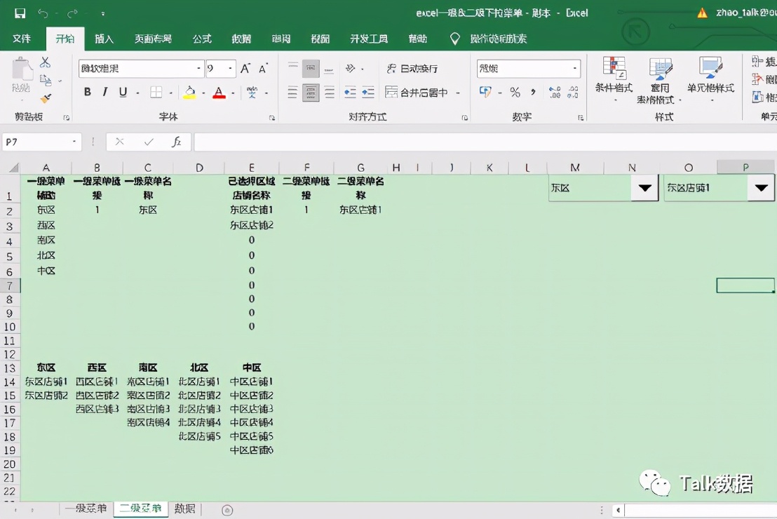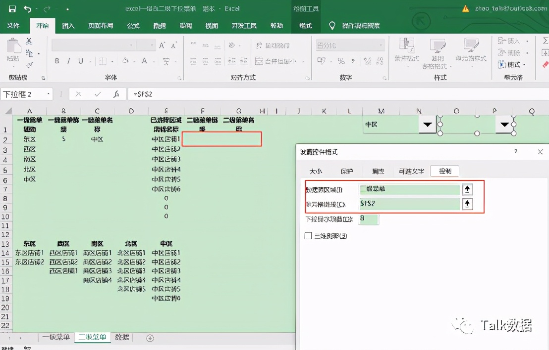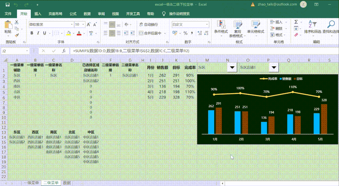 但是有些时候一级菜单无法满足需求,比如我要看单店铺的销售目标完成率,好几百家店铺下拉查找很费时间,所以我制作了一个二级下拉菜单,大体思路和操作方法一致。二级菜单是在一级菜单的基础上增加一个二级菜单。