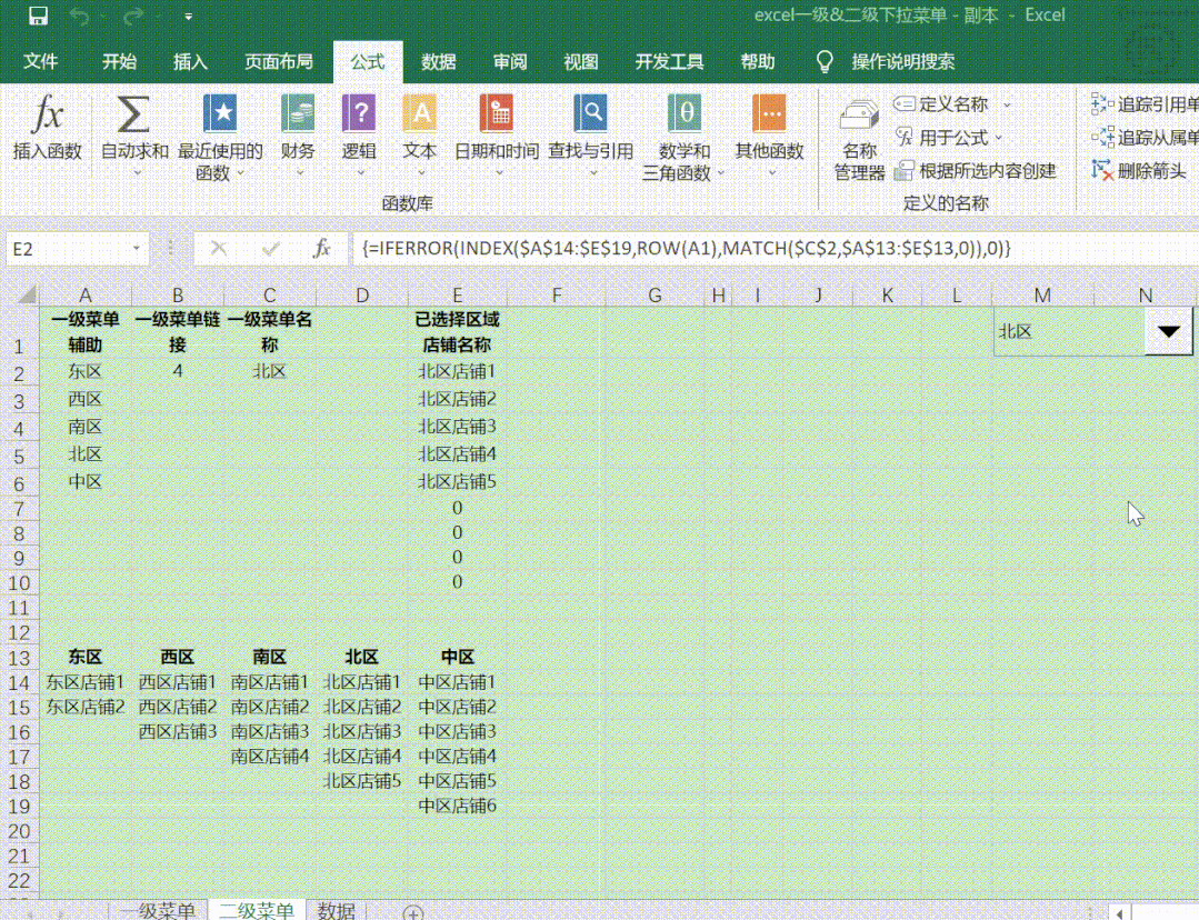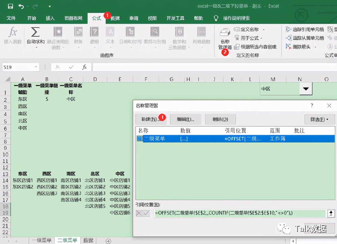 然后需要在名称管理器新建一个名称二级菜单,利用offset动态获取店铺名称,用来作为二级菜单的数据源。=OFFSET(二级菜单!$E$2,,,COUNTIF(二级菜单!$E$2:$E$10,"<>0"),)。