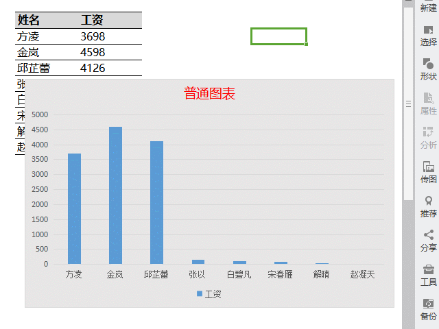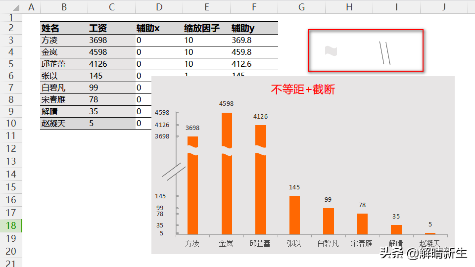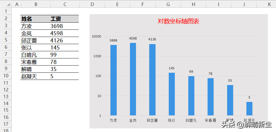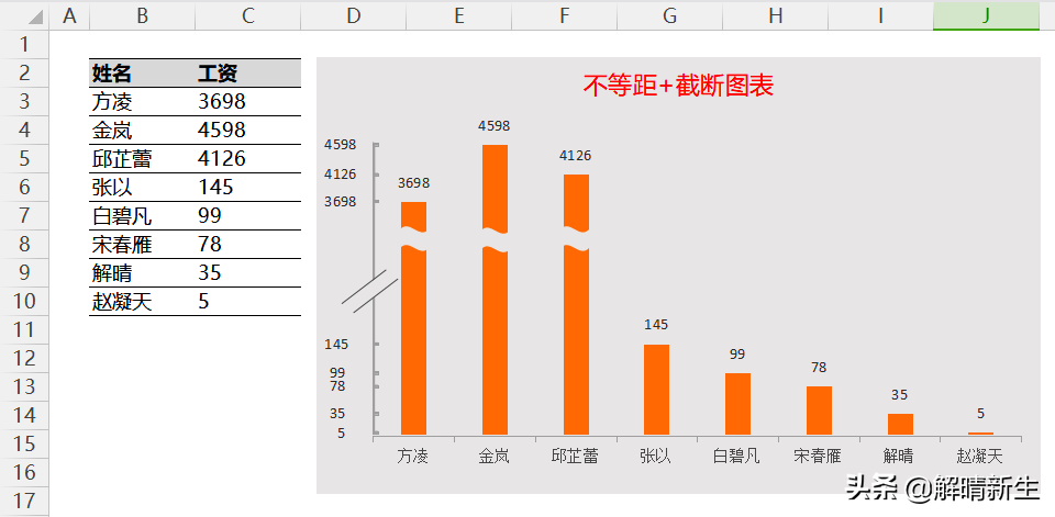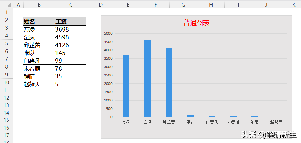 纵坐标轴的刻度是均匀的,但“工资”数值差异很大,以致于后面几个人的数据几乎看不到。当数据差异更大时,图表的效果会更差。