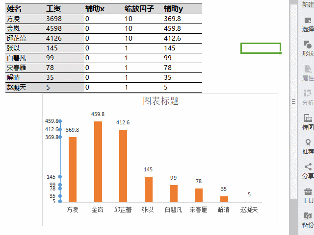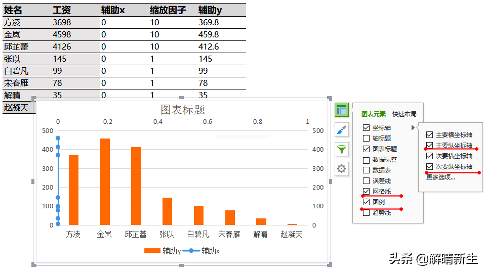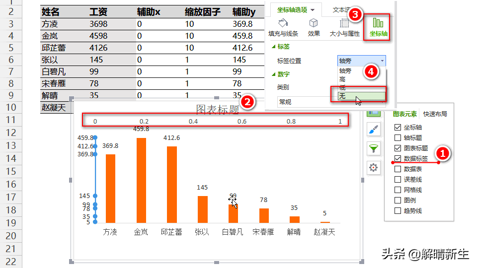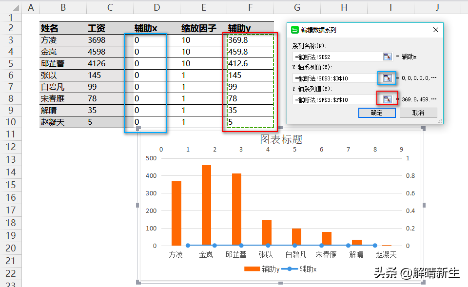 “辅助x”的值全部为0,“辅助y”等于“工资/缩放因子”,“缩放因子”可以随意设置,目的是缩小各个工资数值之间的差异。