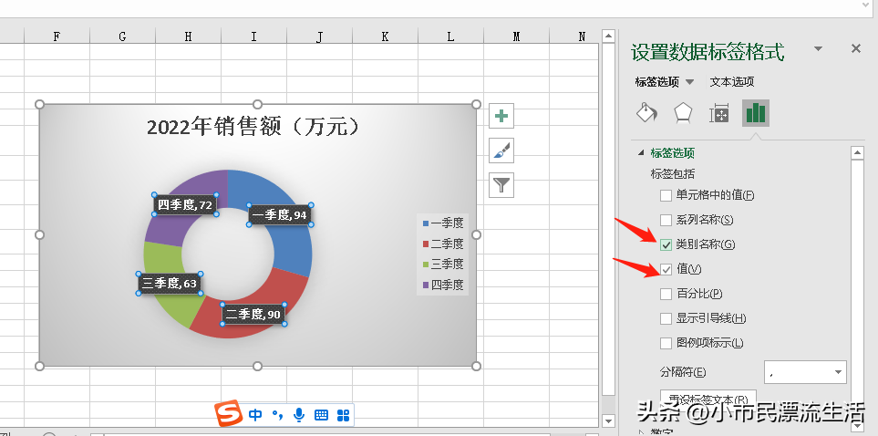 在【设置数据标签格式】对话框界面,单击*类别名称*和*值*,使其左侧复选框增加√标识,此时饼图增加了类别名称季度和销售金额。