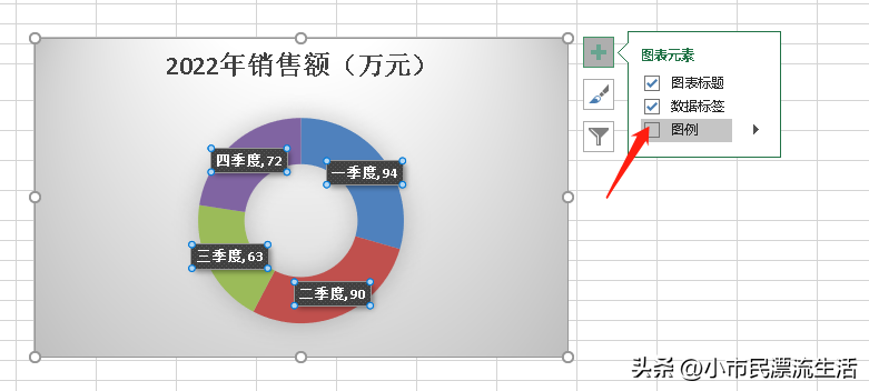 在上一步使用数据标签已在饼图上增加了季度名称,饼图不需要在单独显示图例信息,选中图表,单击图表右上加的+图标按钮,单击*图例*取消复选框中的√标识。