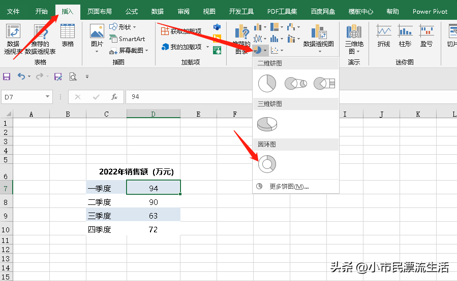 选中源数据表区域中的任意包含数字的单元格。然后选择功能区【插入】选项卡,在下列*图表*分组中单击“插入饼图或圆环图”图表按钮,在菜单列表中选择*原环图*左键单击。