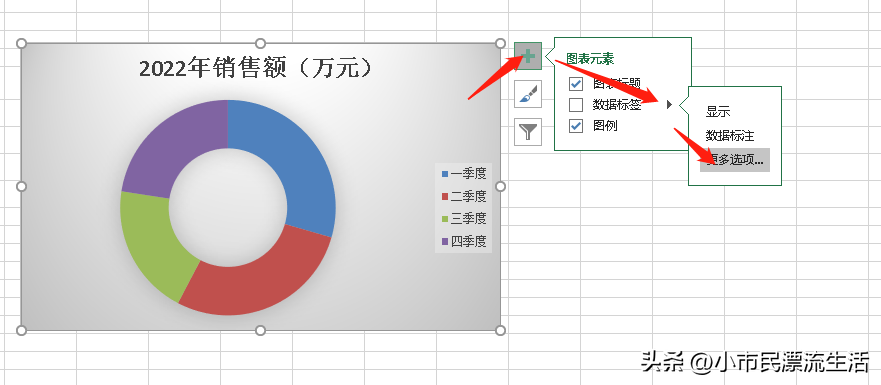 选中图表,单击图表右上加的+图标按钮,接着选择列表中*数据标签*右侧三角形标识,选择*更多选项*。