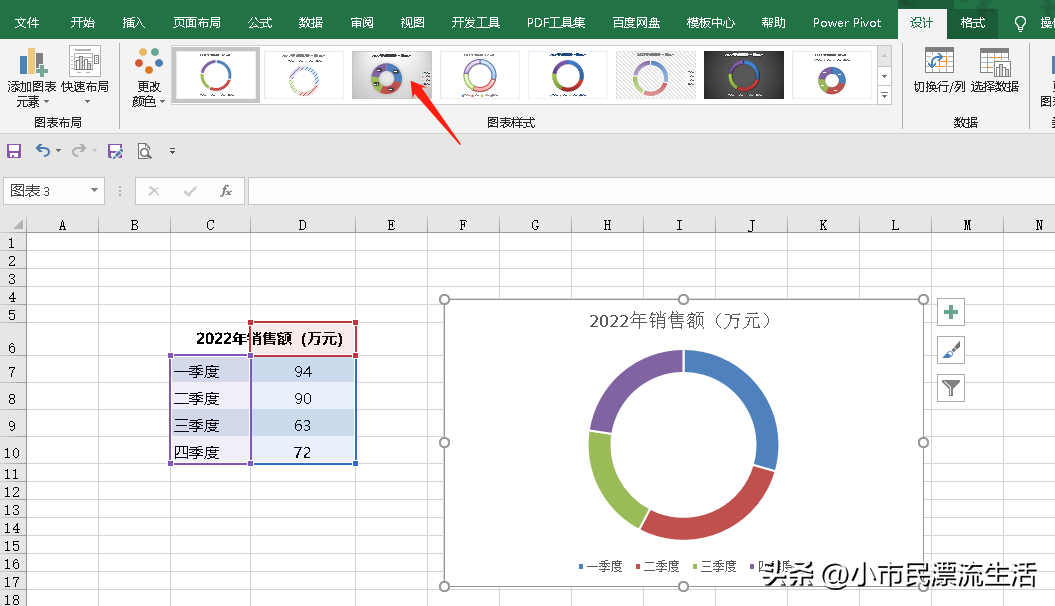 选中图表,在工作表顶部的图表的专属【设计】选项卡,在*图表样式*分组中选择一种需要的样式。