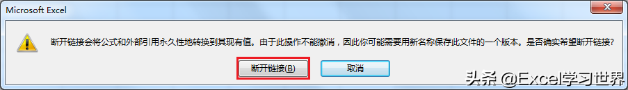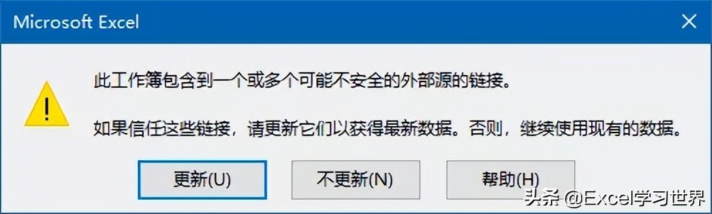 当我们打开一个 Excel 文件时,有时会出现下面这样的弹窗,这是因为当前工作簿引用了其他工作簿中的区域。