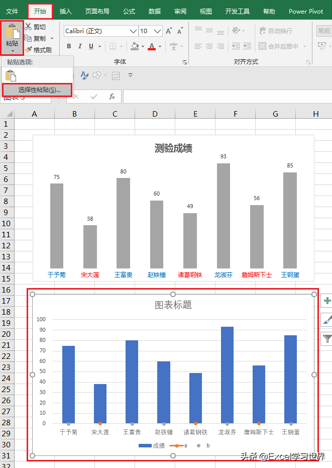 2. 选中下方的图表 --> 选择菜单栏的“开始”-->“粘贴”-->“选择性粘贴”