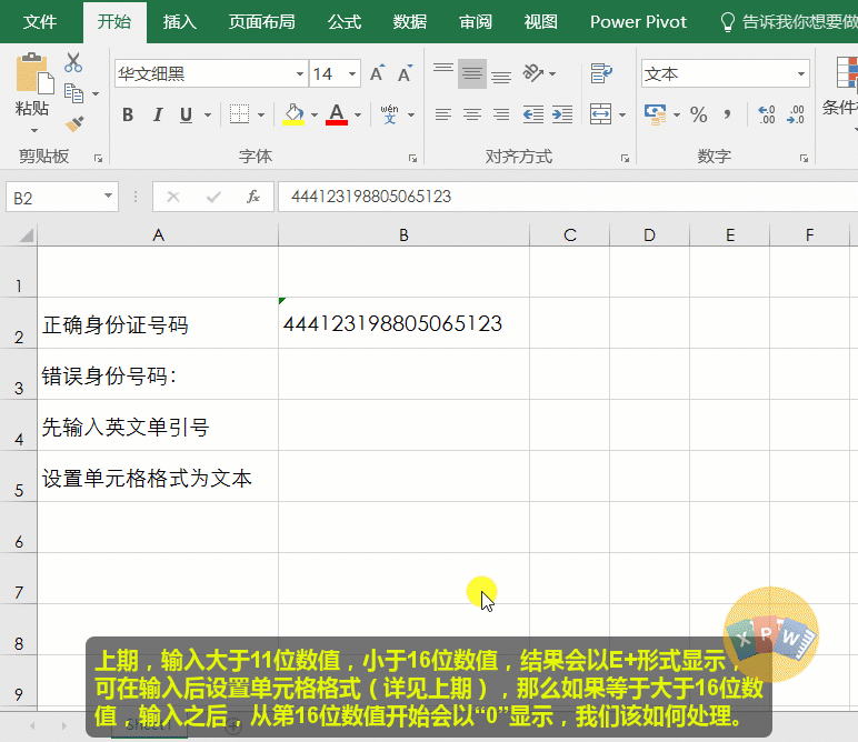 在EXCEL中,输入大于11位数值,小于16位数值,结果会以E+形式显示,但可以输入后再设置单元格格式(详见上期),那么如果等于大于16位数值,输入之后,从第16位数值开始会以“0”显示,我们该如何处理?
