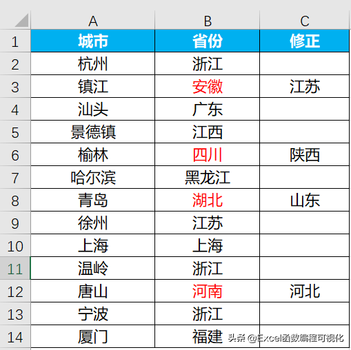 下图中B列省份存在错误的情况,修正数据在C列中,如果将数据同步到B列中去呢?