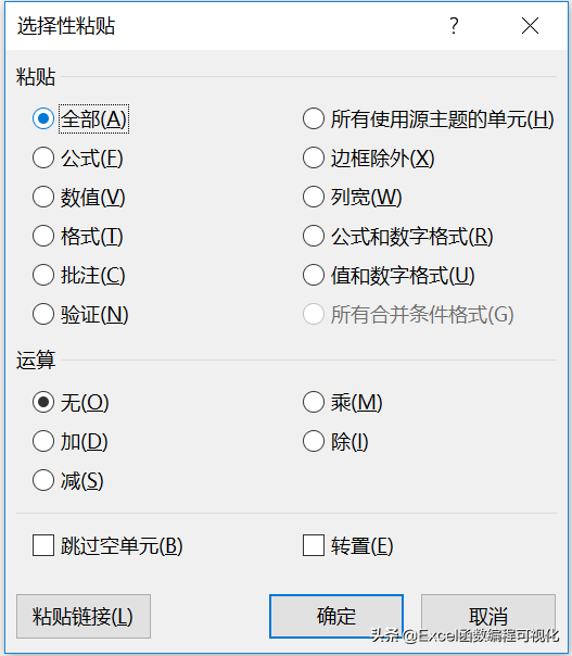 Excel复制粘贴并不是简单的Ctrl+C、Ctrl+V,在粘贴的时候,右键鼠标,选择【选择性粘贴】,会弹出下图界面,其中包括多种粘贴格式,部分使用频率极高。