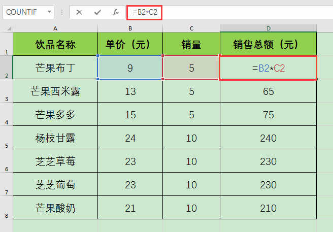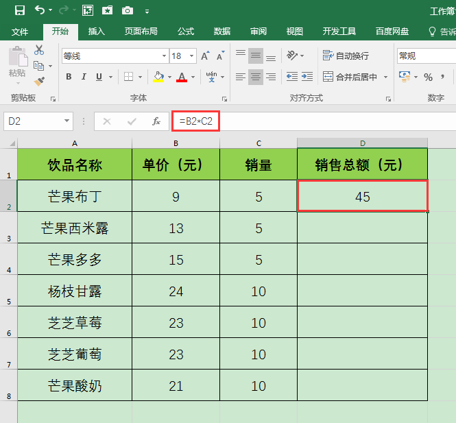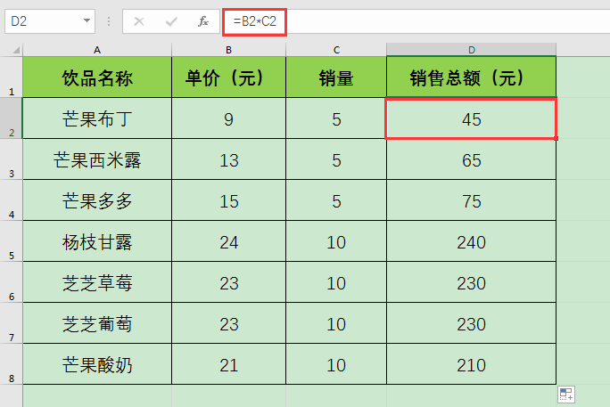 应用场景:将下图工作表D2单元格中的公式(=B2*C2)向下复制至D8单元格。