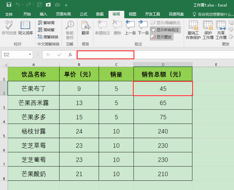 返回工作表,鼠标单击选中含有公式的单元格(如D2),上方的编辑栏中已无公式显示。