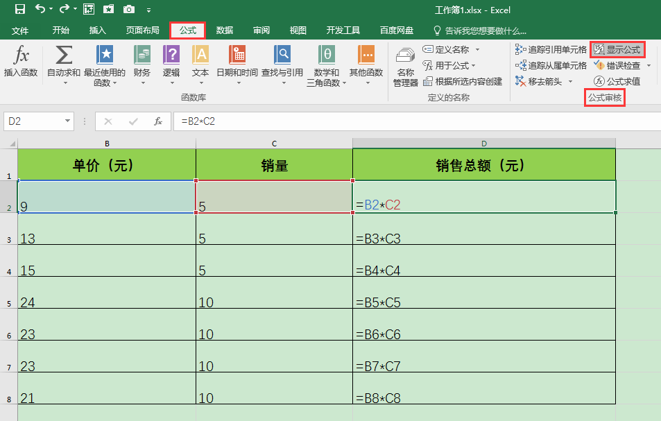 单击"公式"选项卡"公式审核"功能组中的"显示公式"按钮,即可显示出表格中的所有公式。
