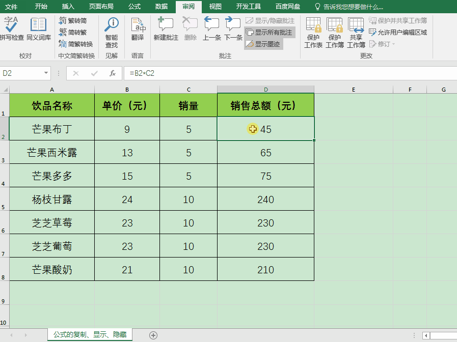 (小提示:如果要撤销对工作表公式的隐藏保护,可在"审阅"选项卡"更改"功能组中单击"撤消工作表保护"按钮,在弹出的"撤消工作表保护"对话框中输入之前设置的保护密码,最后单击"确定"按钮即可。)