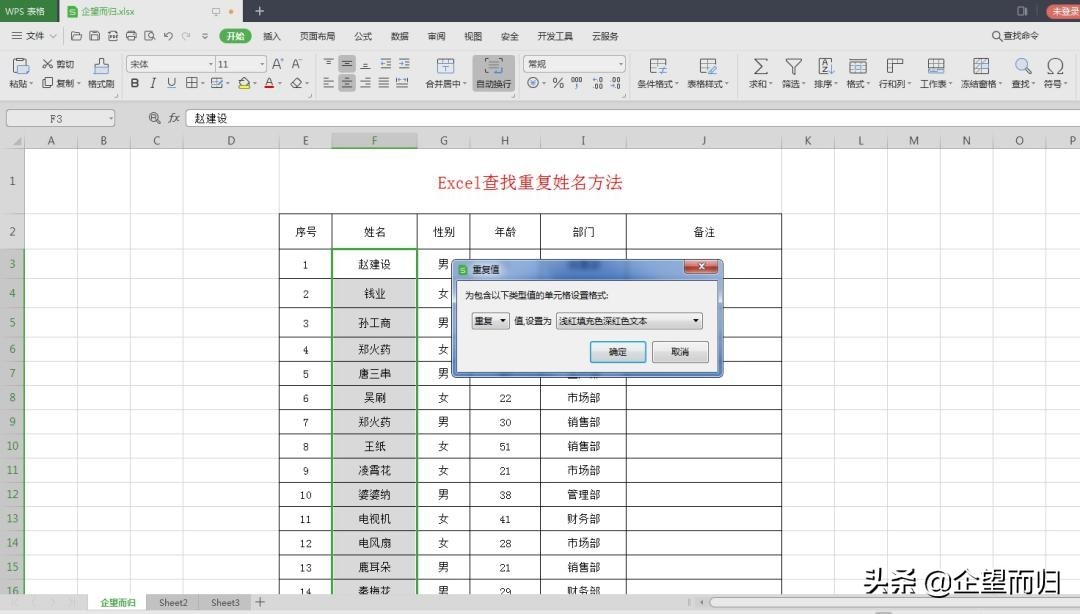 点击后,弹出的重复值菜单中可以为重复类型的单元格设置格式,可以进行调节,直接点击确定为默认自动设置,我们这边直接点击确认,重复值背景色自动默认变为浅红色,一下子就找出来了,大家学会了吗?