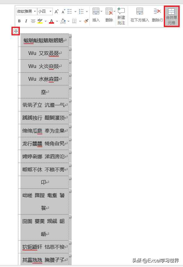 3. 在 Word 中选中表格左上角的“+”符号 --> 右键单击 --> 在弹出的菜单中选择“合并单元格”