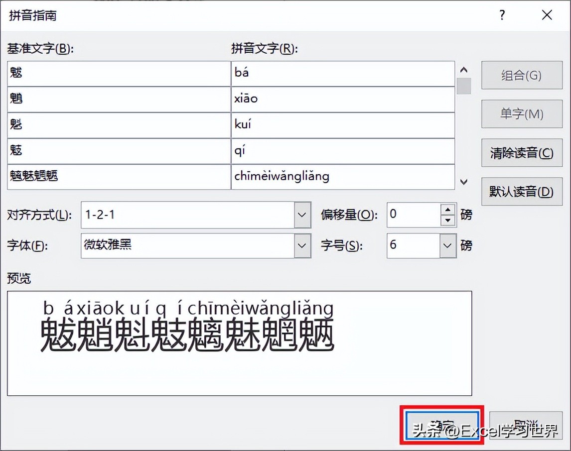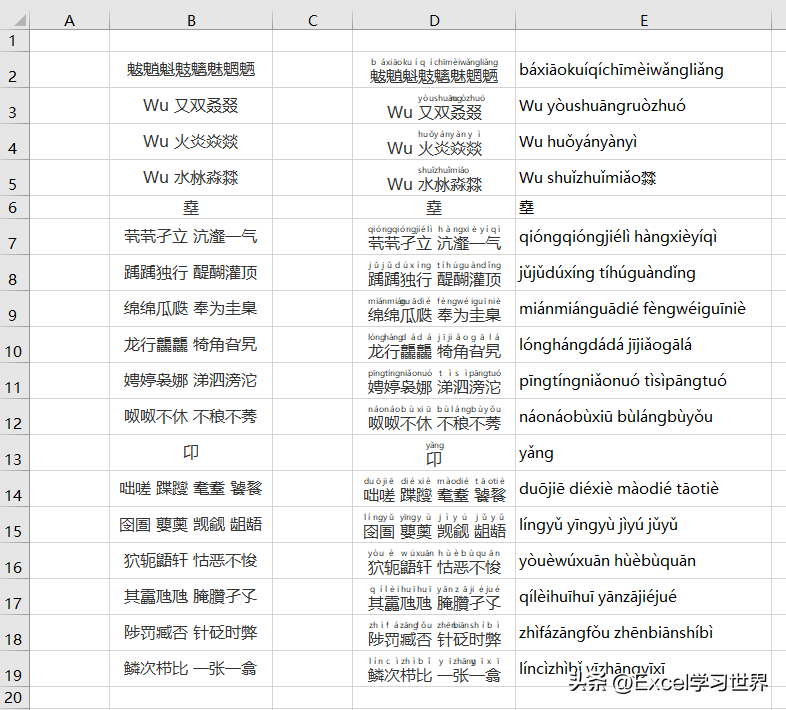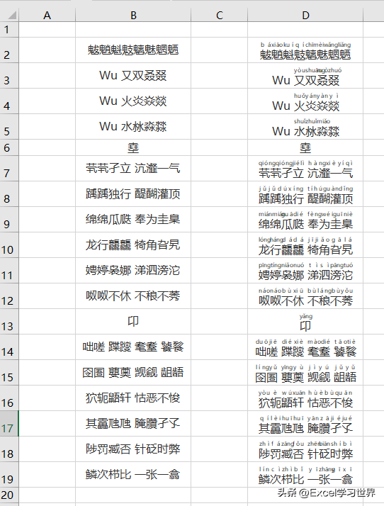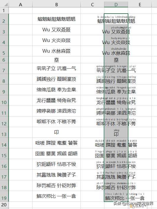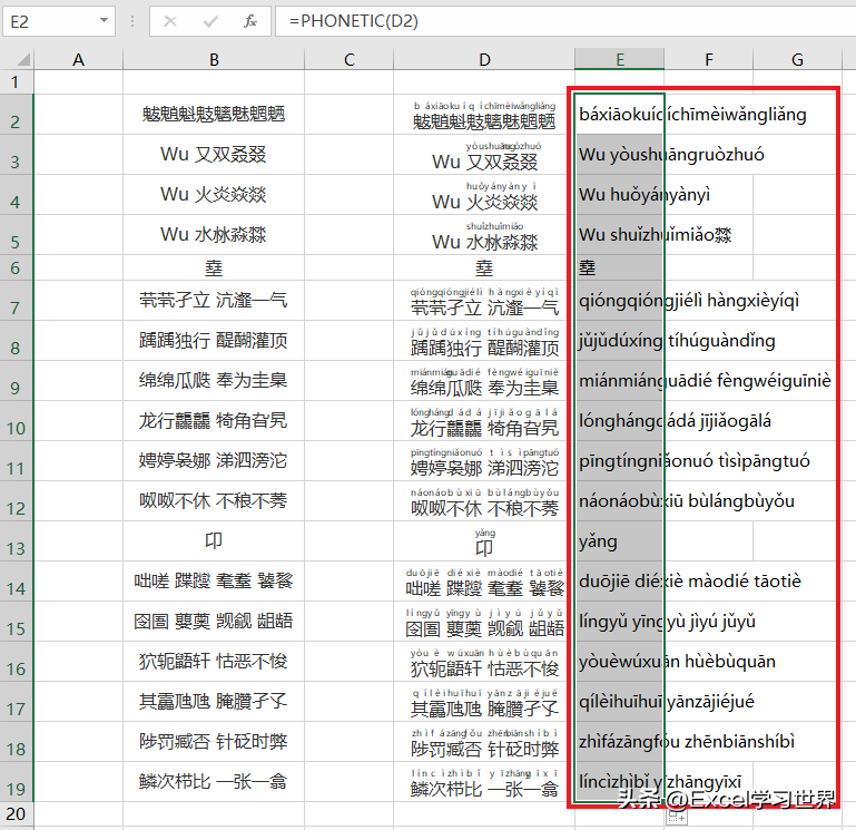 请给每个字都标上拼音,为了方便查看,再将拼音单独提取出来放到一列中,效果如下图 2 所示。