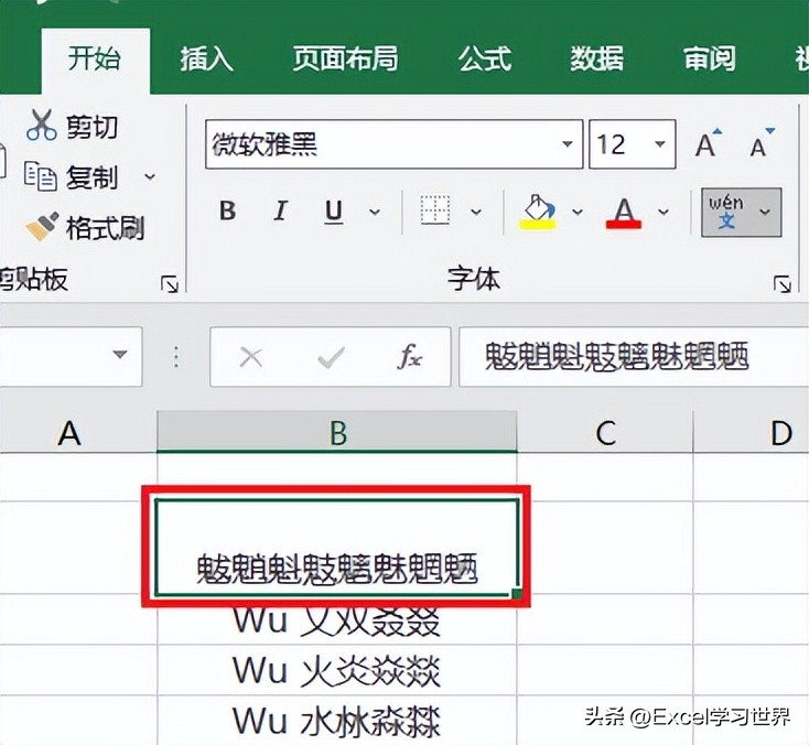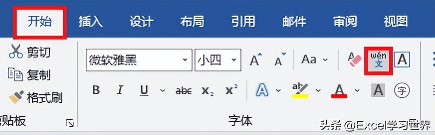 4. 选中单元格中的文字,而不是选中整个单元格 --> 选择菜单栏的“开始”-->“显示或隐藏拼音字段”