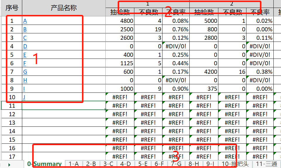 原工作簿示例,如下.图1是每个不同产品的按周来统计一下每种产品的不良率,区域1是序号、名称与区域3工作表的名称一一对应,区域2是2023年第1周、第2周....到54周。