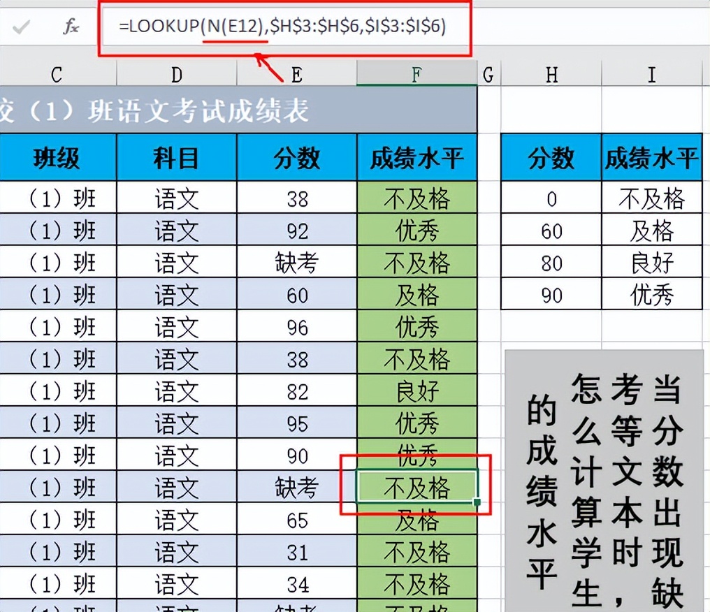 怎么理解呢?这列E12单元格是“缺考”,所以N(E12)的结果是0,而lookup函数的第一个参数查找值为0,它匹配的结果是分数段0对应的“不及格”。
