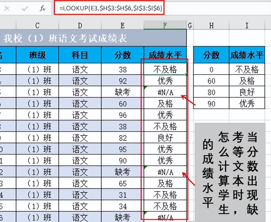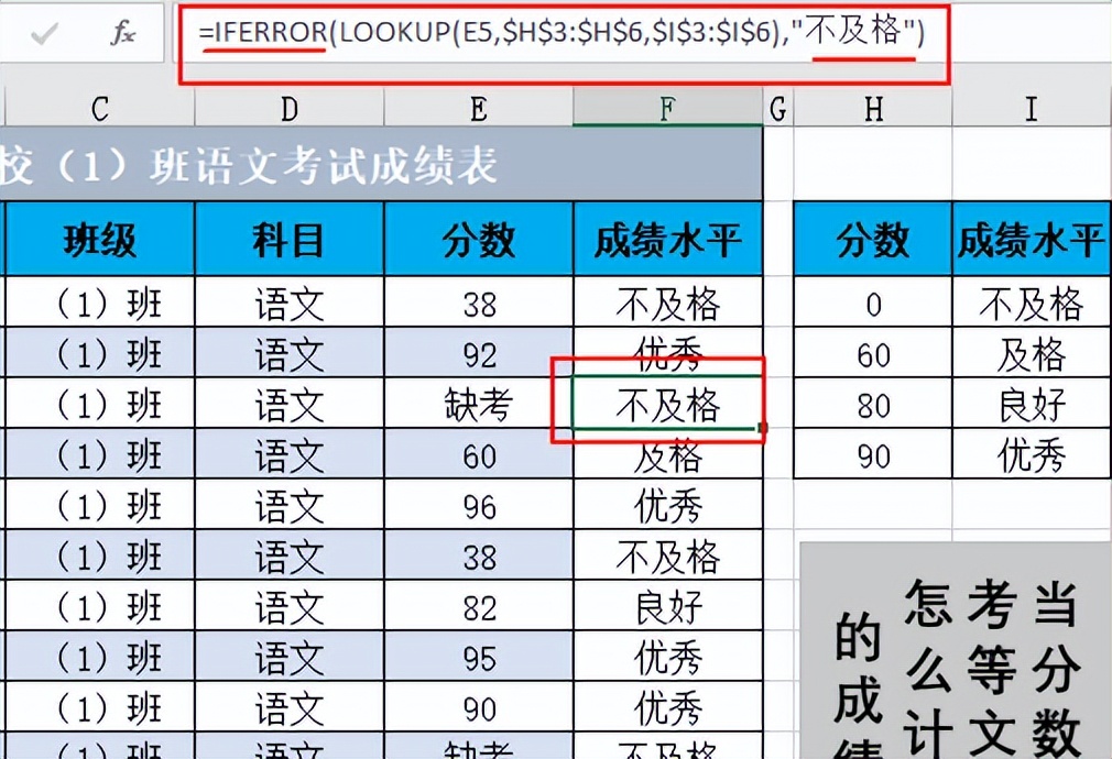 在这里,作者直接给之前的公式套上iferror的“外衣”,完整公式为:=IFERROR(LOOKUP(E5,$H$3:$H$6,$I$3:$I$6),"不及格")