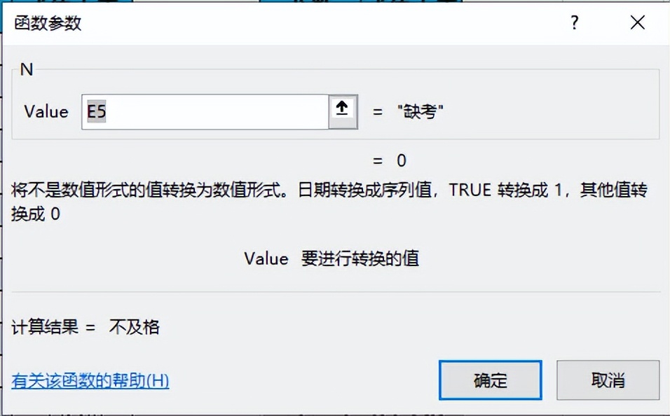 通过它的这个效果,我们可以知道当学生缺考,如果套上N函数,即N(“缺考”),参数是文本,结果返回为0.