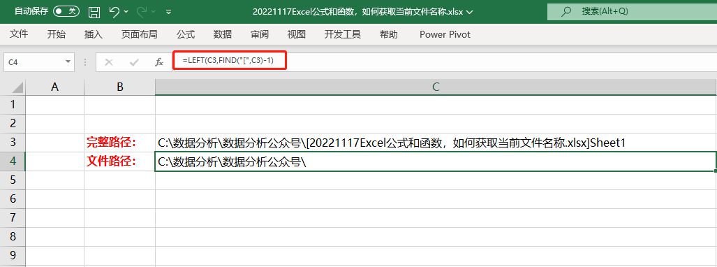 此时我们还可以使用文本函数对这三部分进行分解。可以发现这里的Excel文件名称是由“[]”括号括起来的。使用FIND函数可以获取“[”字符的位置,再结合LEFT函数获取文件路径。