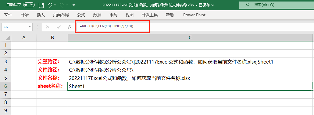 使用FIND函数可以获取“]”字符的位置,再结合RIGHT函数和LEN函数获取sheet名称。