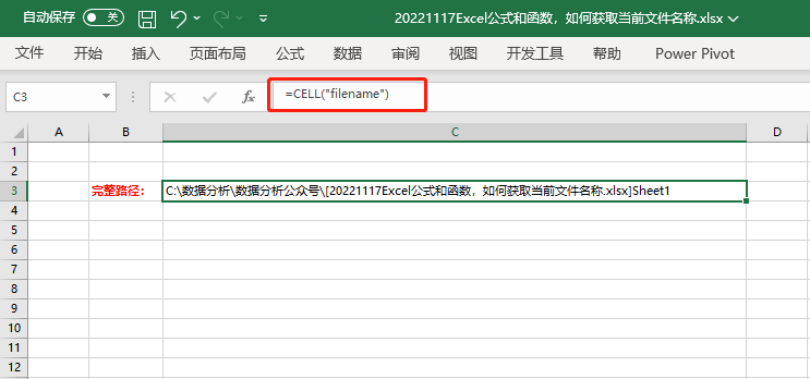 此时我们可以使用CELL函数,CELL函数能够返回单元格的格式、位置或内容的信息。在函数中填写参数"filename",可以获取当前工作表的完整路径,它由文件路径、Excel文件名称、sheet名称三部分组成。