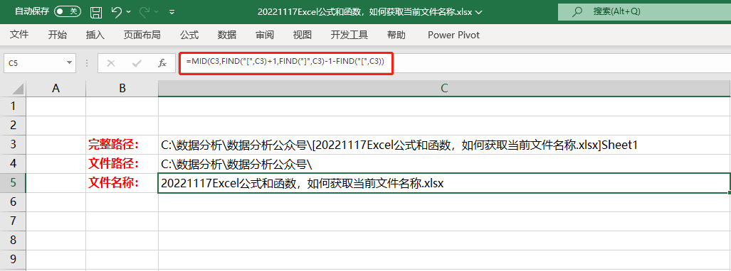 使用FIND函数可以获取“[”字符和“]”字符的位置,再结合MID函数获取文件名称。