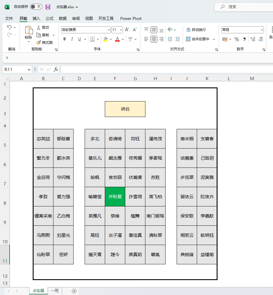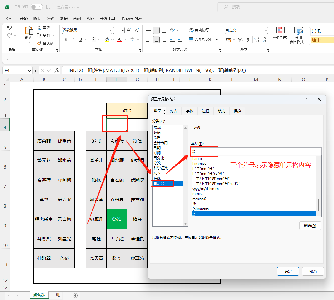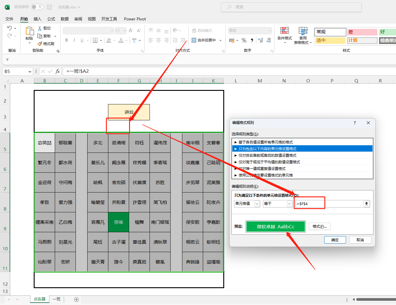 第四步:给座次表区域【$B$5:$K$11】添加条件格式,规则是单元格的值等于刚刚随机返回的姓名,即$F$4,然后添加喜欢的样式即可,按住F9就可以随机抽选幸运儿了。