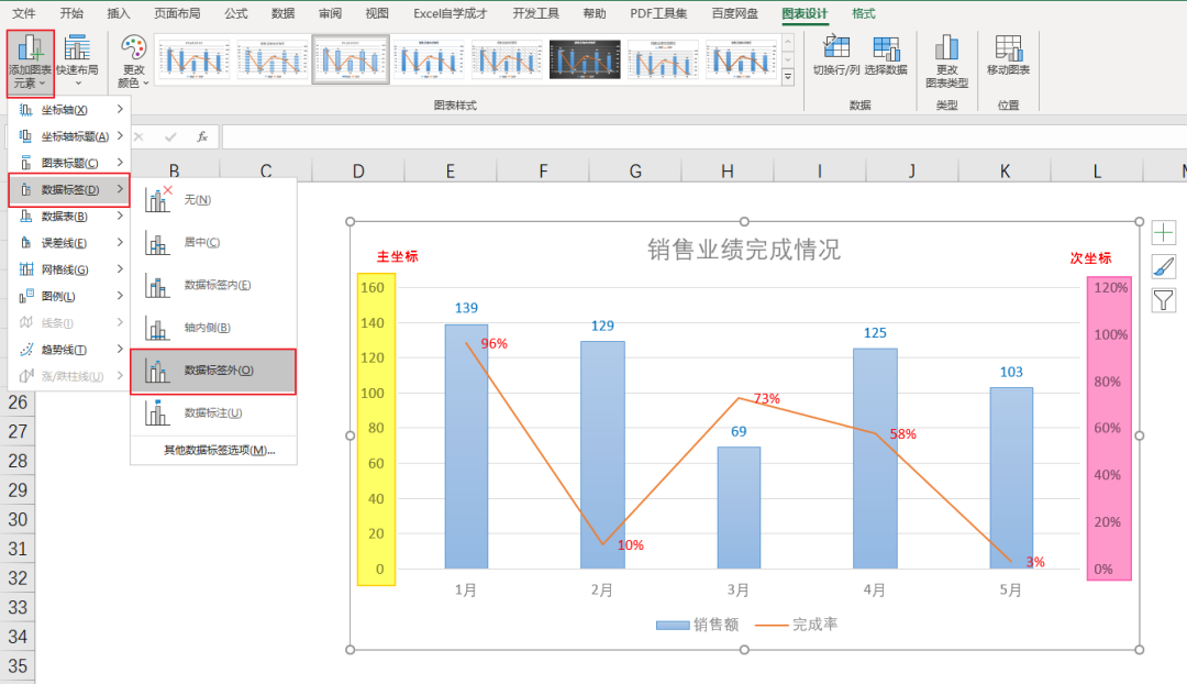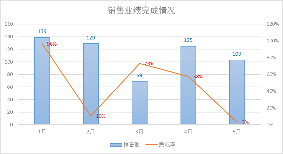 这是因为,我们的销售额数据都是60-140之间,所以主坐标轴自动以20为刻度,然而完成率数据都是100%以下,也就是1以下,所以在同一个坐标轴上面,完成显示不出来。