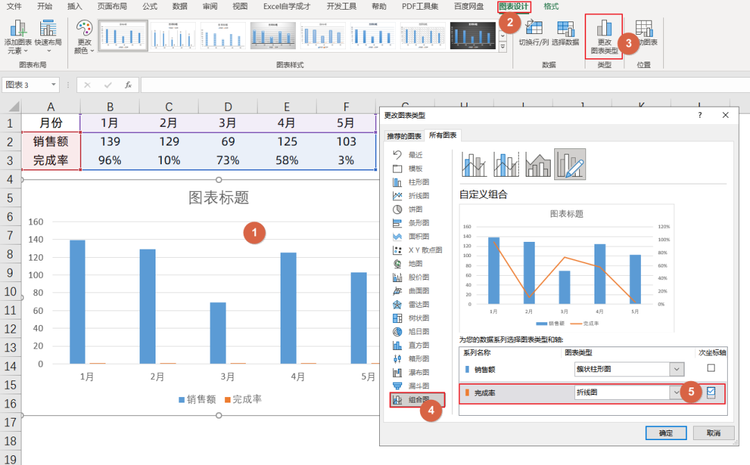 然后选择组合图,然后将完成率图,修改成折线图,勾选次坐标