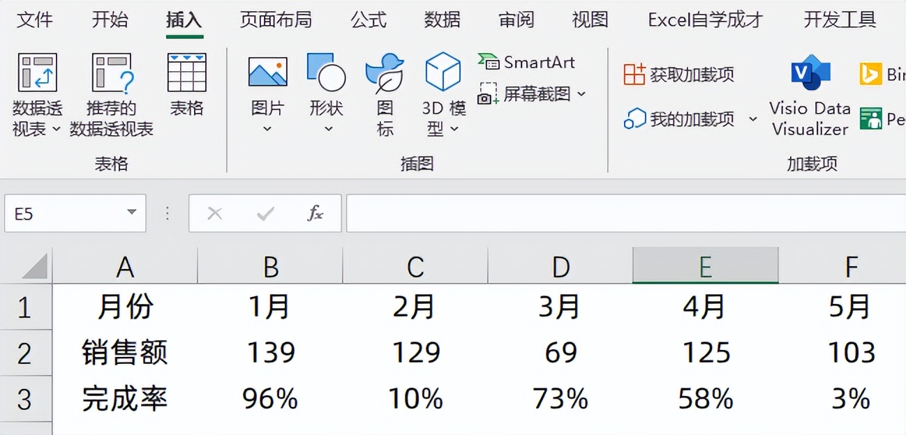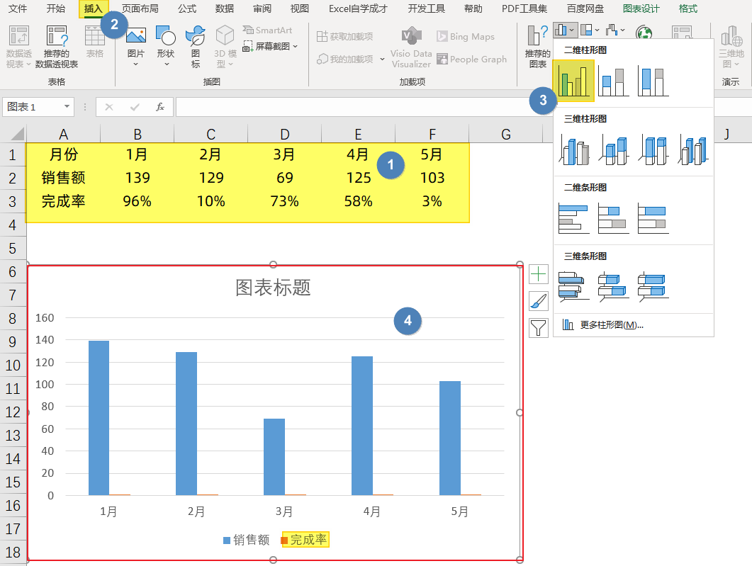 举个工作中的例子,下表是公司上季度的销售数据,以及对应的完成率,我们希望用图表来展示出来