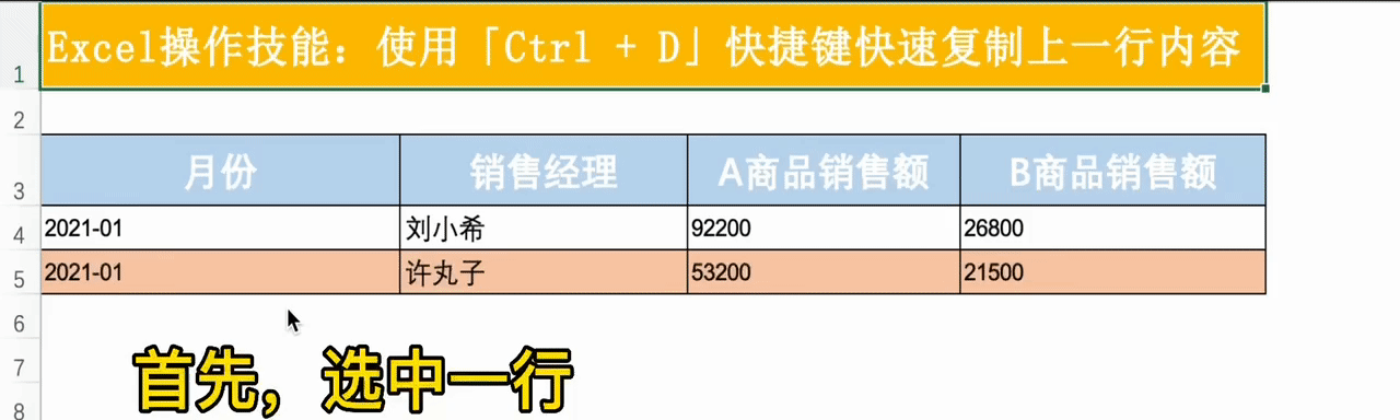 如下表所示,需要快速复制上一行内容到下面一行中。