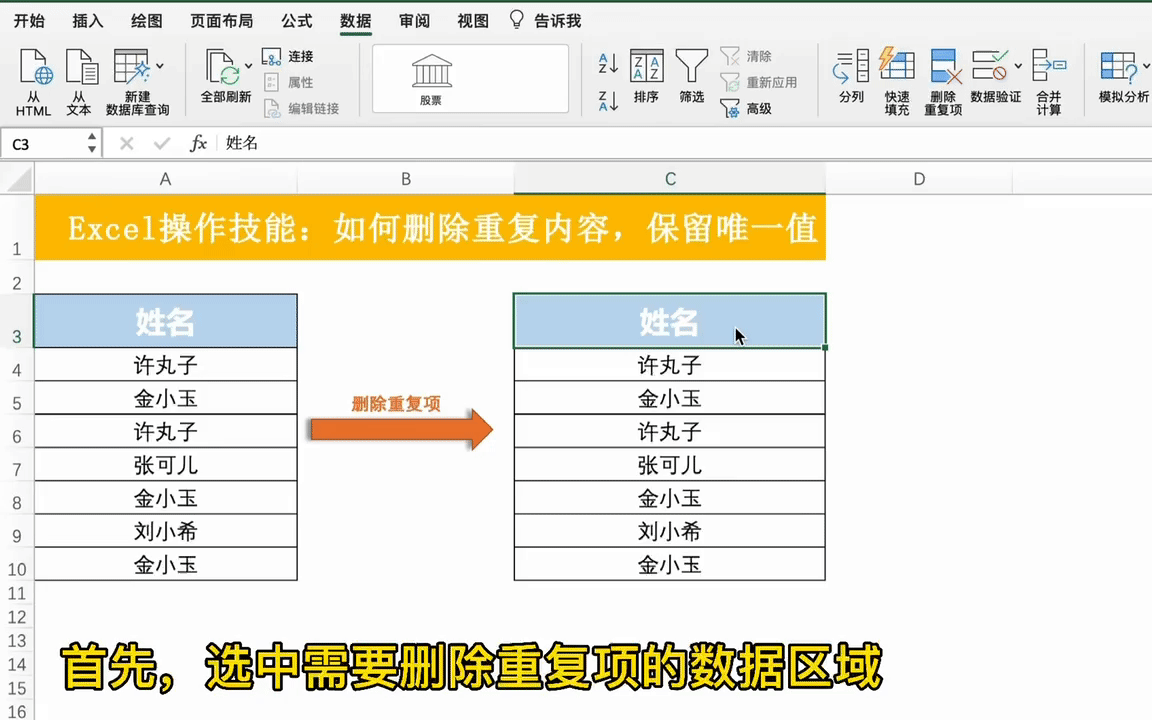 如下表所示,需要删除“姓名”列中的重复项,保留唯一值。