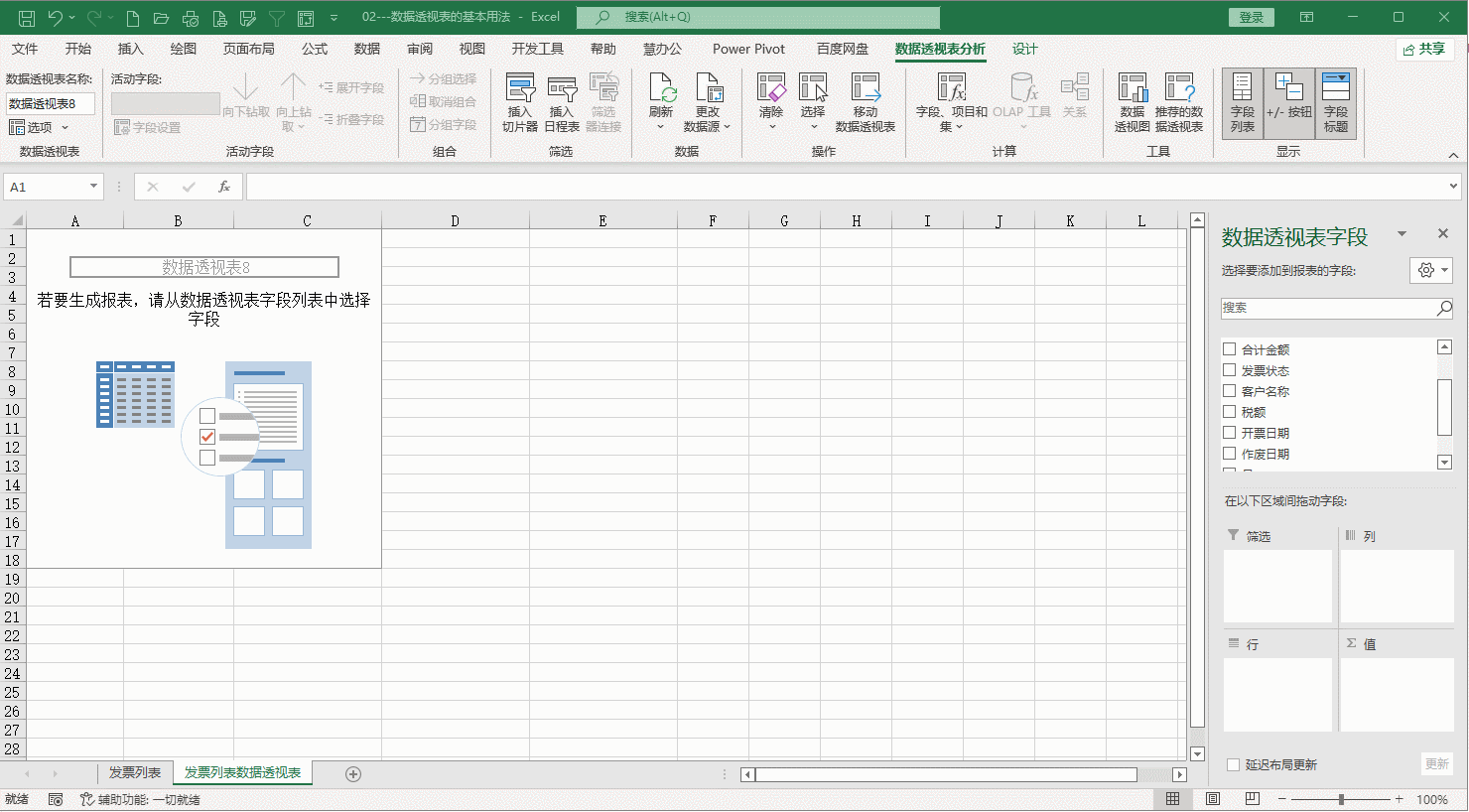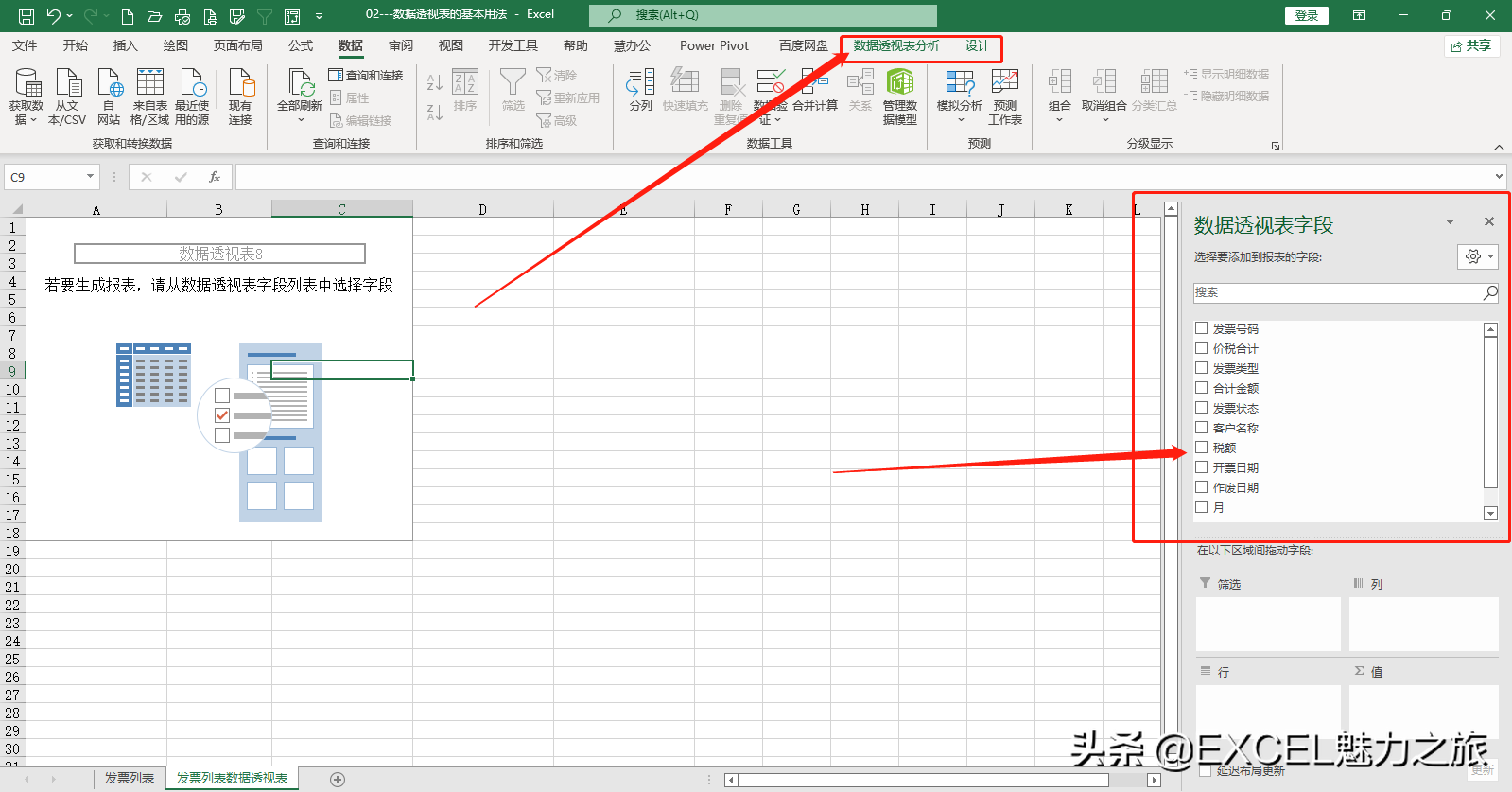 将字段列表里的“开票日期”拖动到行区域,将“税额”、“合计金额”、“价税合计”三个字段拖动到值区域。筛选区域、行区域、列区域、值区域里如果是多字段的,字段顺序很重要,影响数据透视表数据结构。动图二。