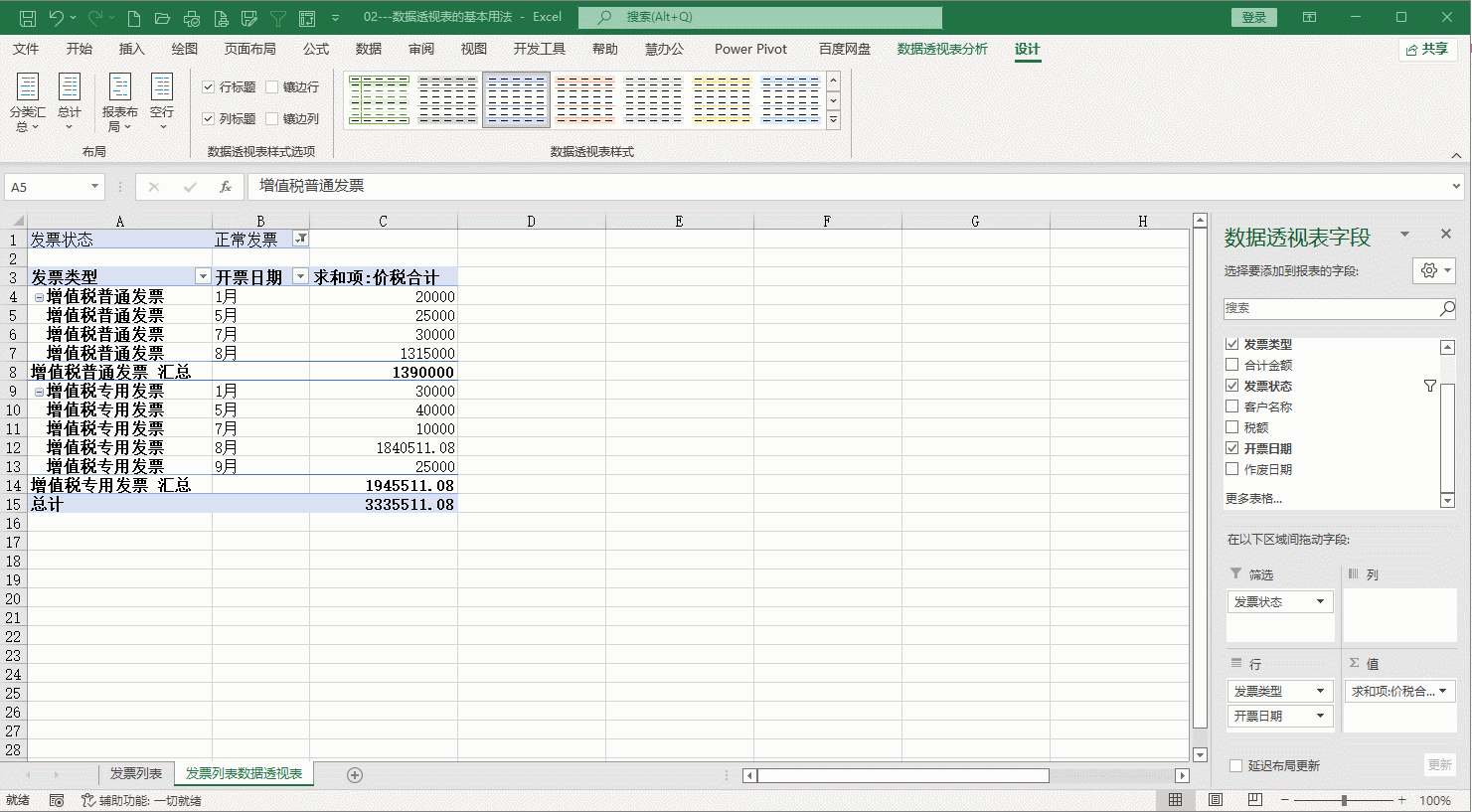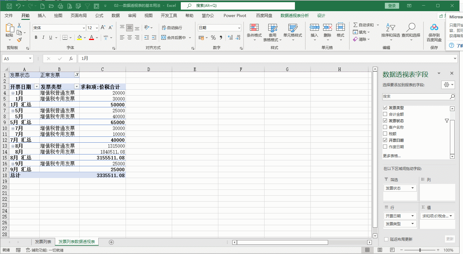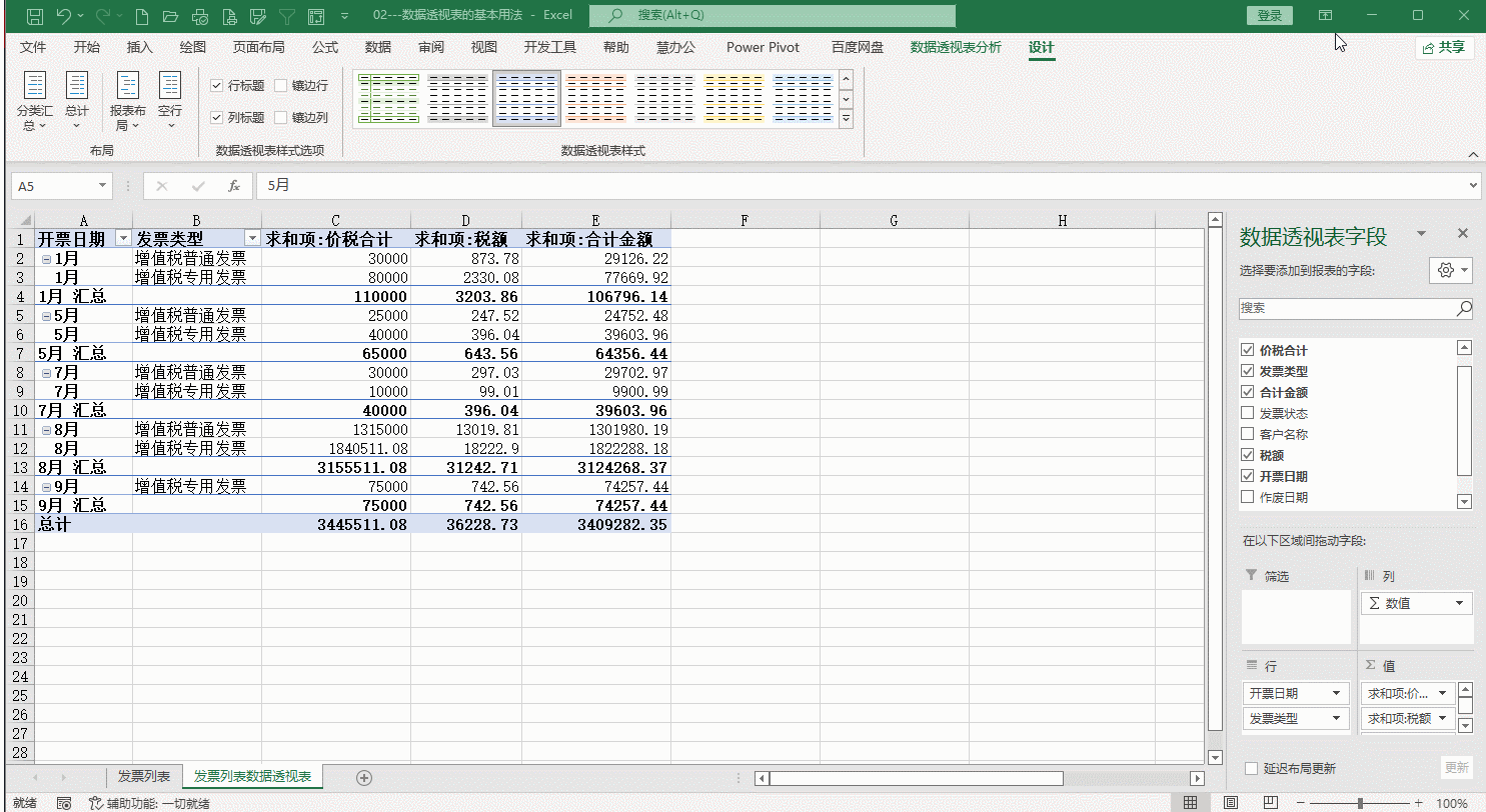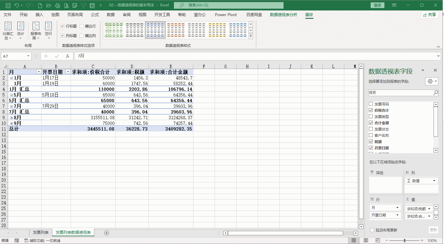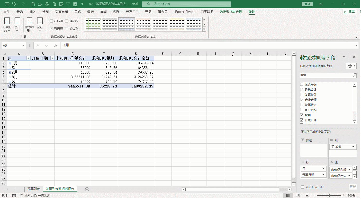 还是前面的案例“发票列表”,今天我们来学习数据透视表的基本用法,最常见的用法就是分类汇总,先看财务上最常见的按月合计这三个字段税额、合计金额、价税合计。