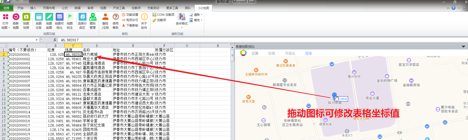 如果发现标注位不对,可以直接拖拽图标至正确点位,此时新的坐标值会自动更新到表格行中。实现地图和表格联动更新。