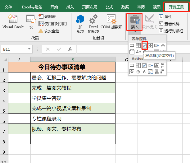 点击【开发工具】选项卡中的【插入】按钮,选择【复选框】控件,在A2单元格画出复选框,单击删除文字;